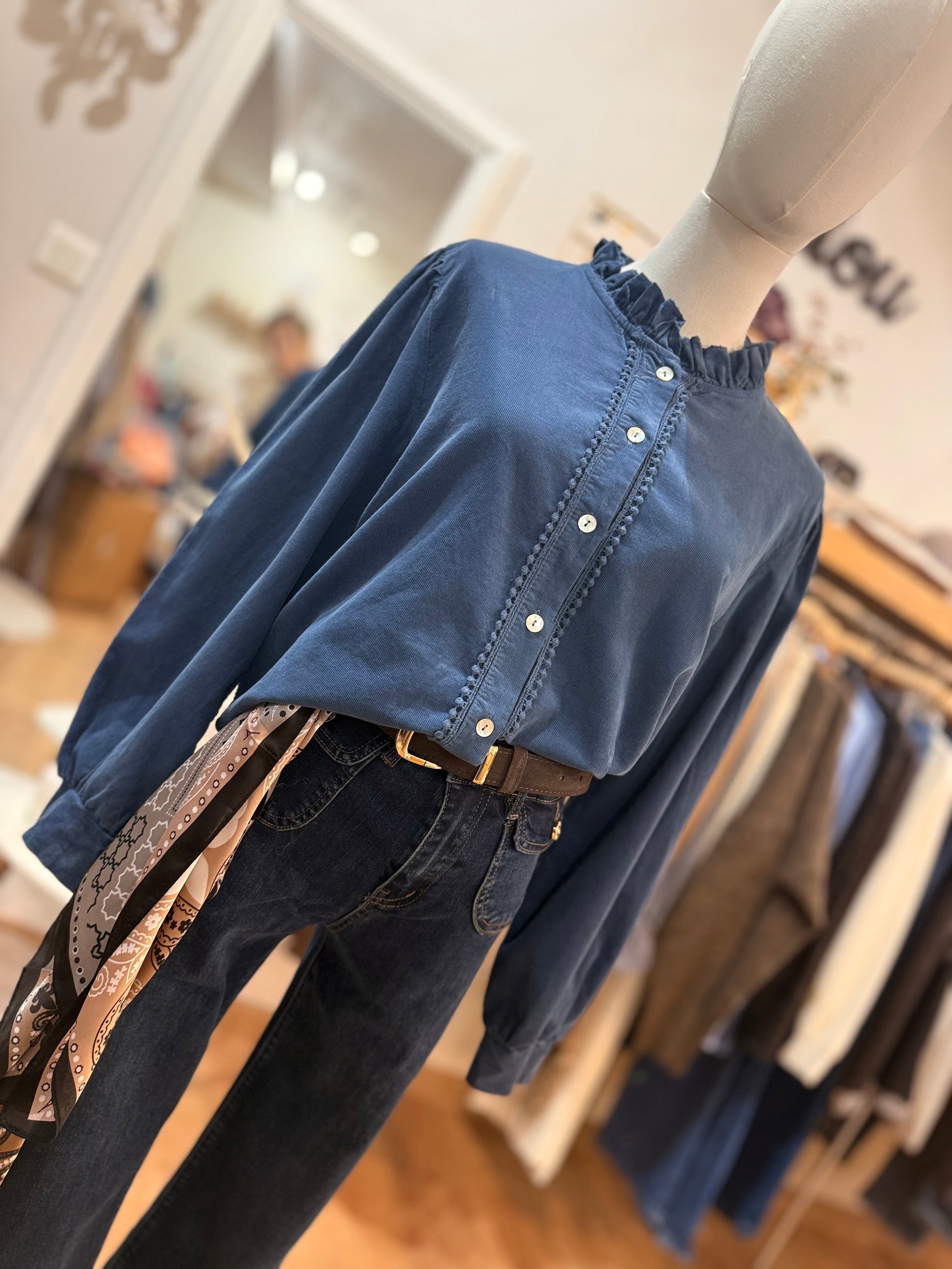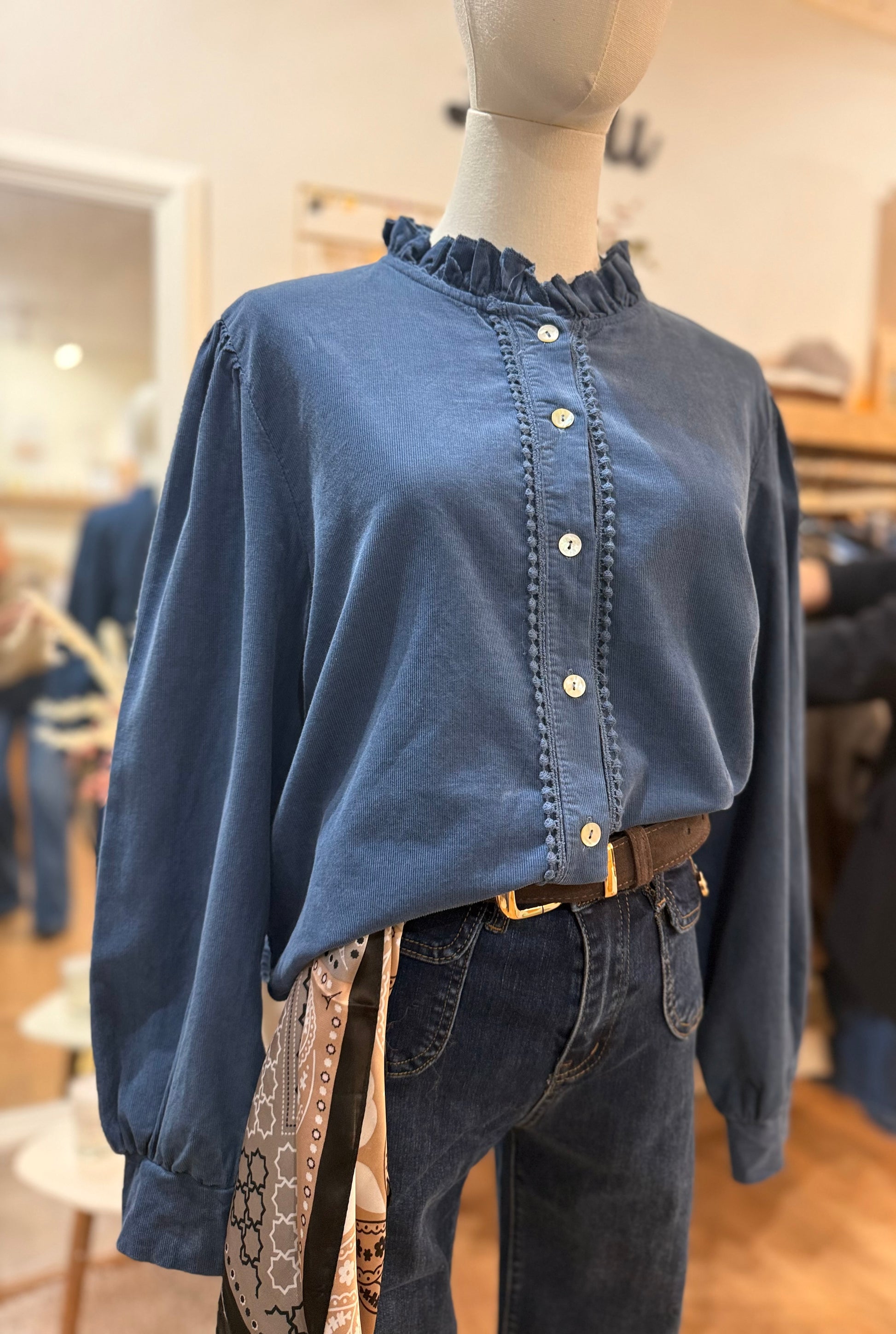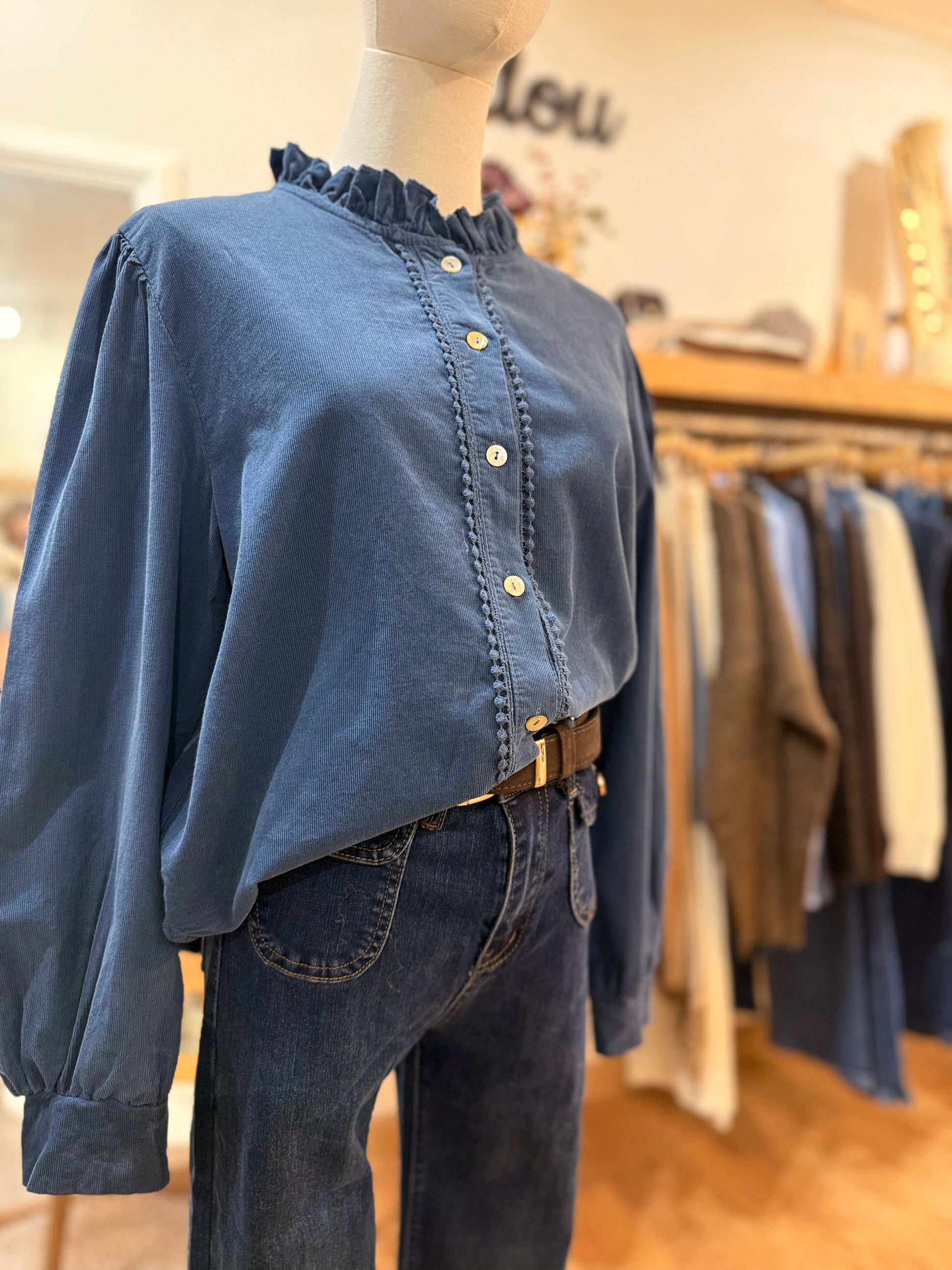 - ses manches longues légèrement bouffantes terminées par un poignet boutonné,