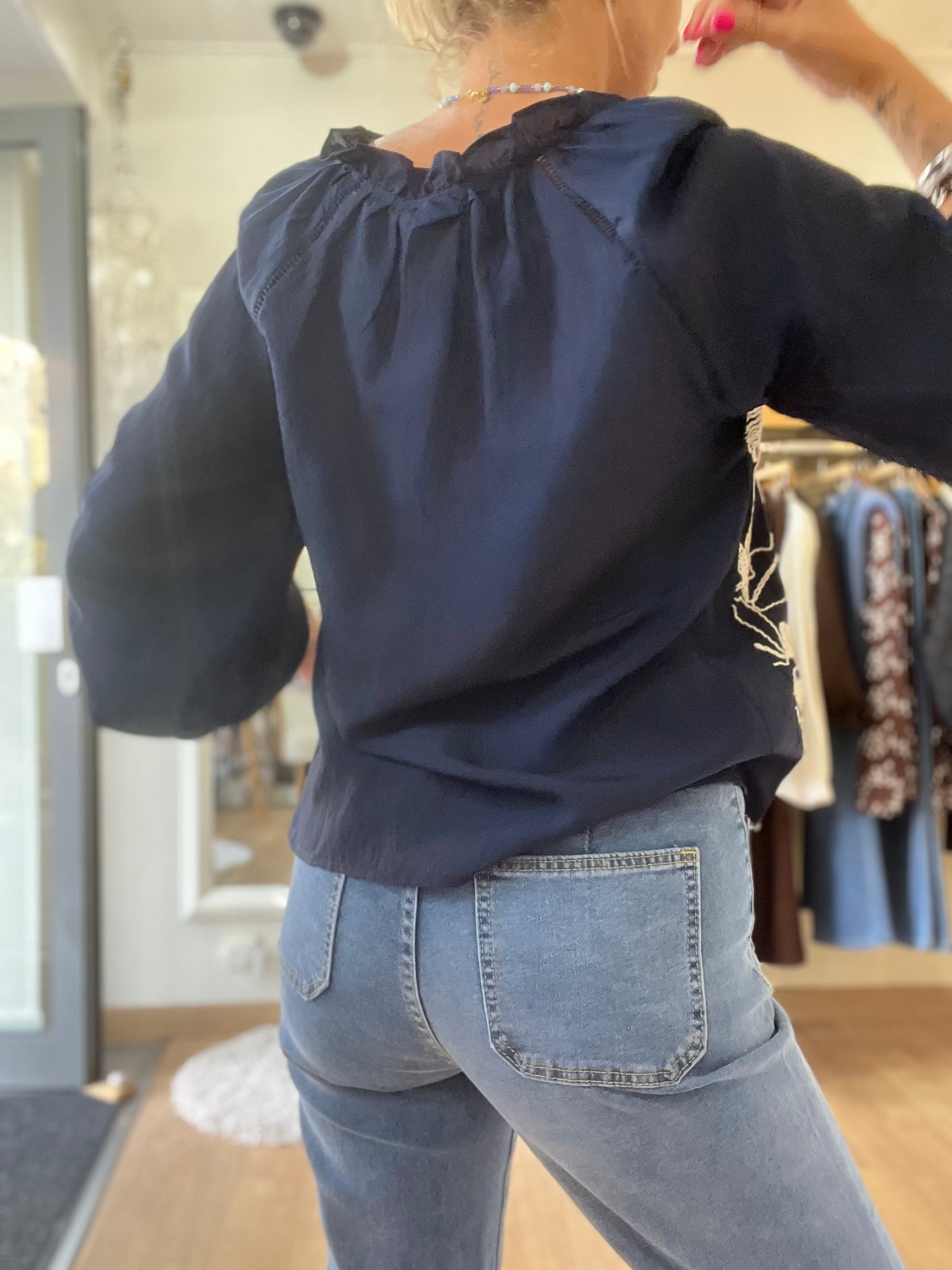 La blouse Azura séduit par son tissu fluide et ses superbes broderies contrastées.