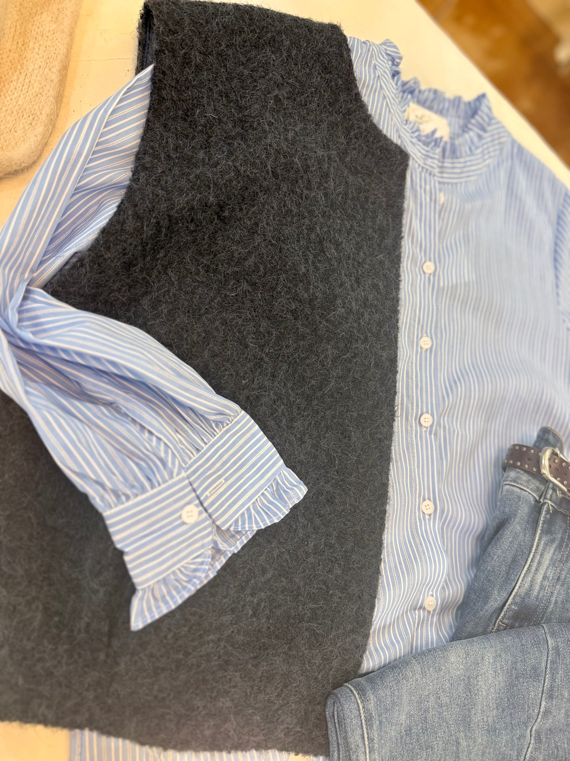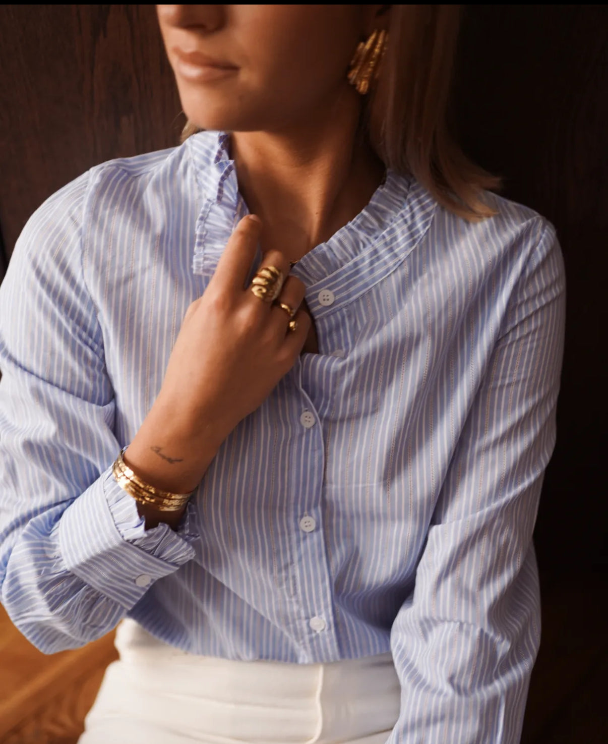 La chemise Jeannette est la pièce chic et intemporelle qui rehausse instantanément une tenue. Avec son col discret volanté, sa coupe féminine et ses fines rayures, elle apporte ce petit twist élégant qui fait toute la différence. Un basique revisité, facile à porter au quotidien comme en tenue plus habillée.