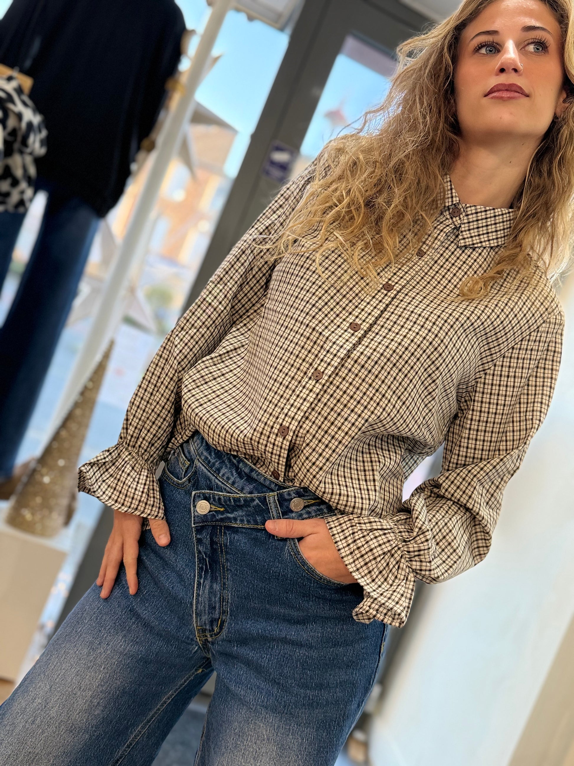 Son motif à petits carreaux apporte une touche moderne, tandis que ses manches légèrement froncées au poignet ajoutent une note féminine.