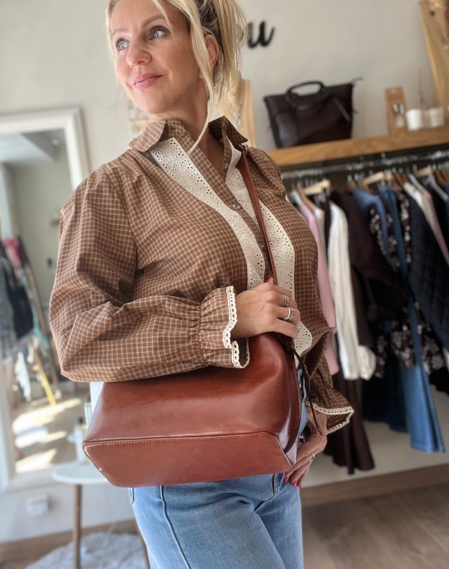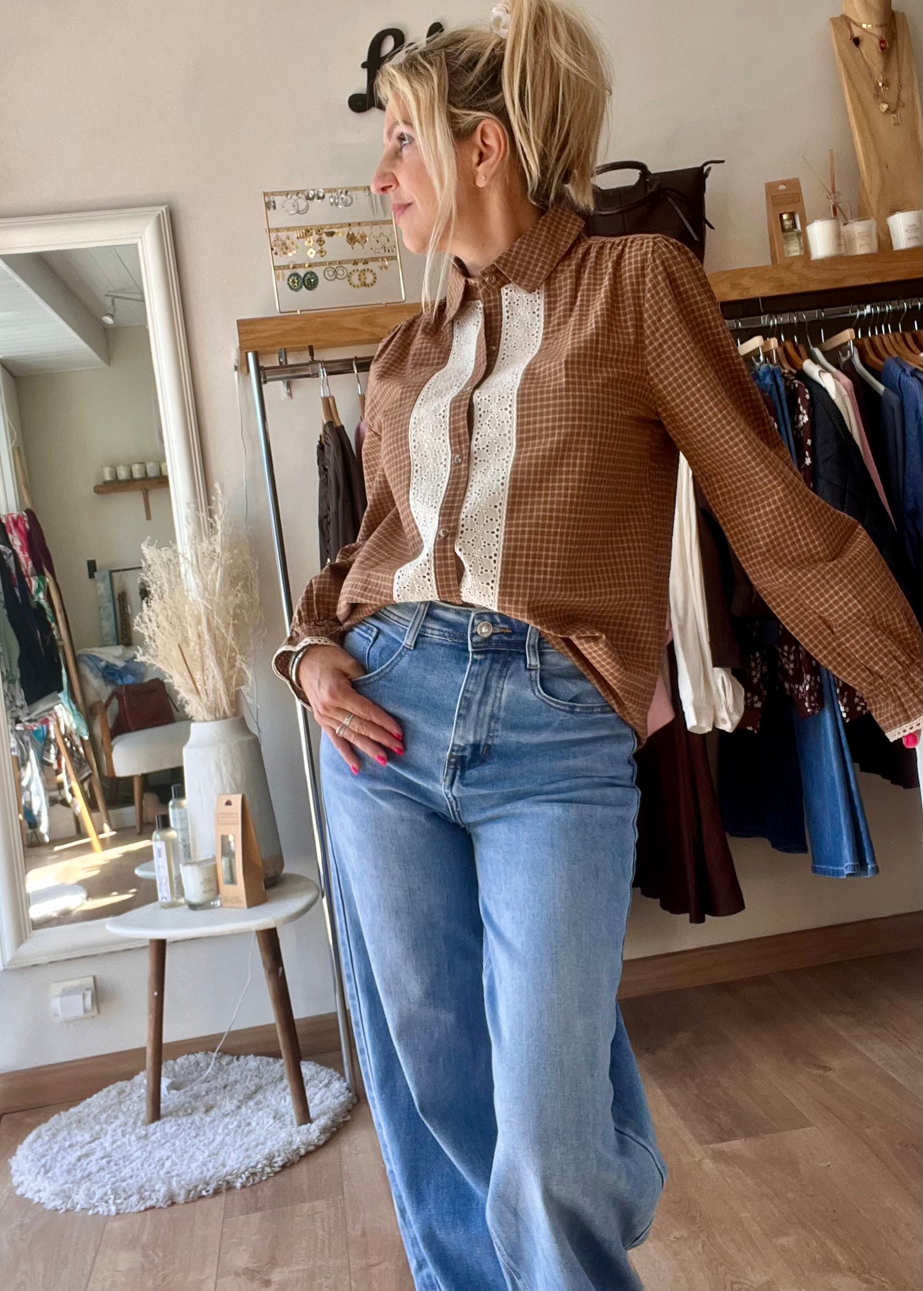 ✨ La chemise « Clara » est un mélange parfait de charme rétro et de modernité. Avec son motif à petits carreaux marron et son empiècement brodé écru, elle apporte une touche romantique à vos looks de saison.
