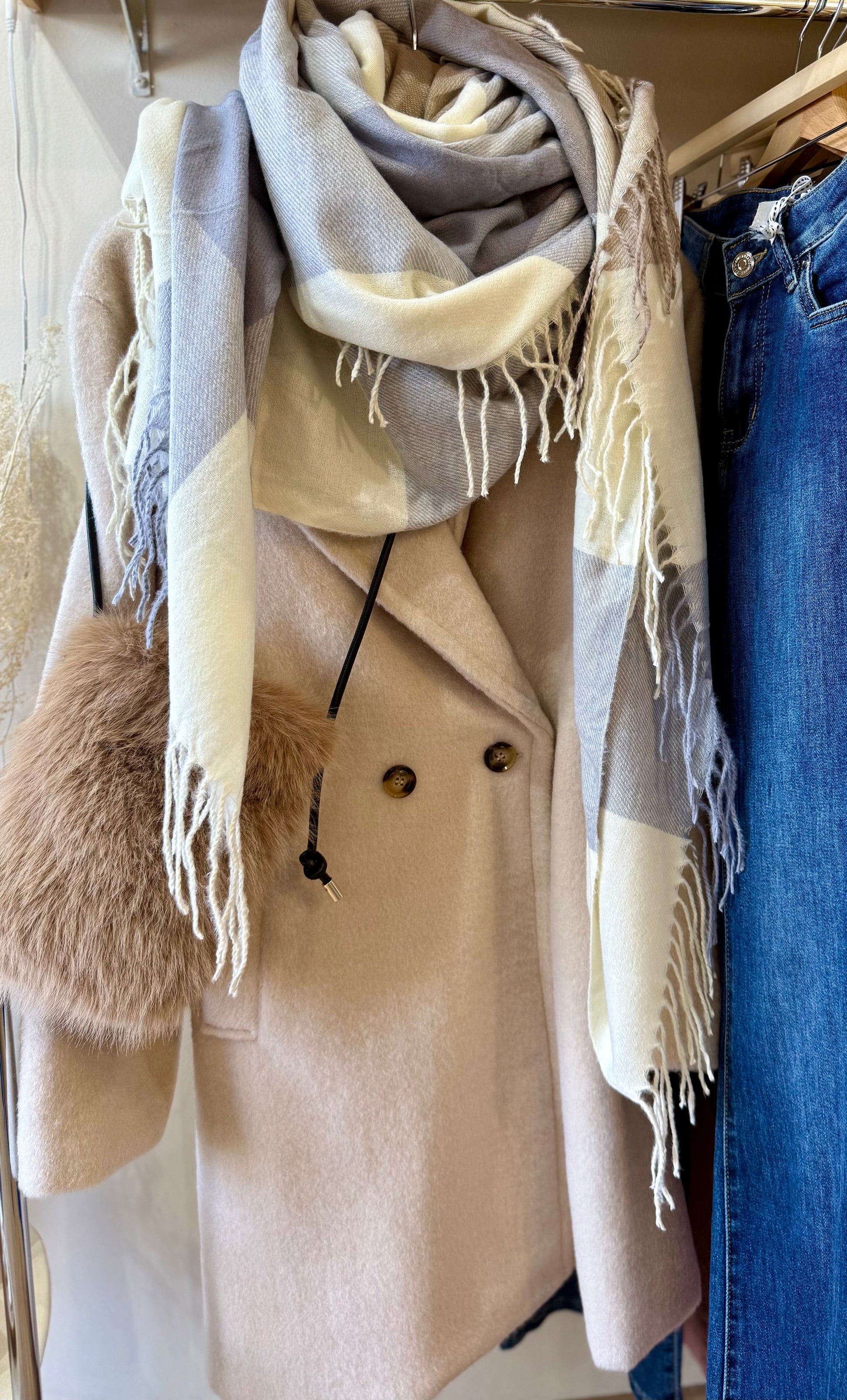 Son grand format carré et son motif à carreaux dans des tons naturels se marient facilement avec toutes les tenues, du manteau en laine au pull oversize.