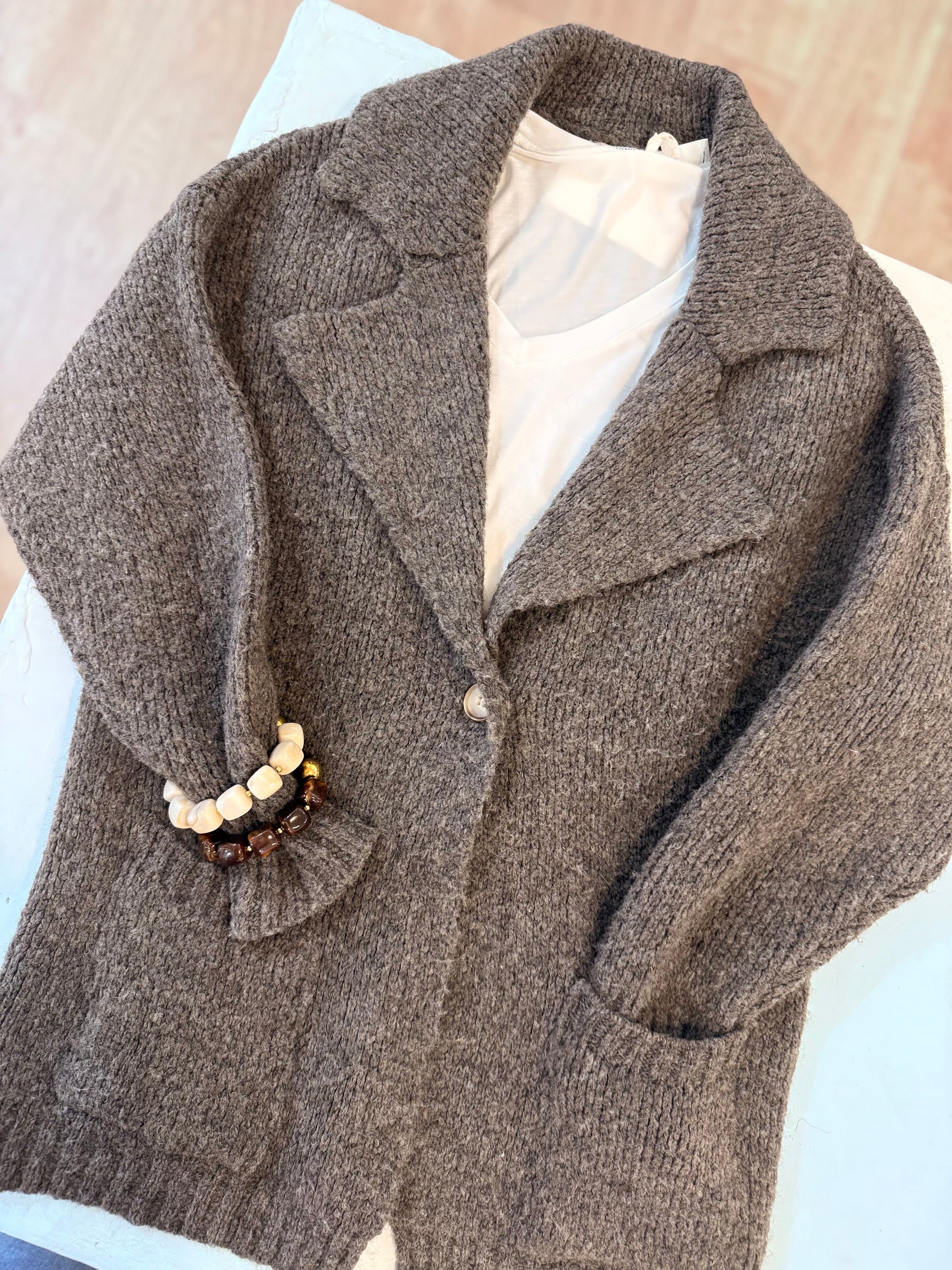 Sa maille moelleuse et son col tailleur lui donnent un style à la fois décontracté et raffiné, idéal pour la mi-saison.