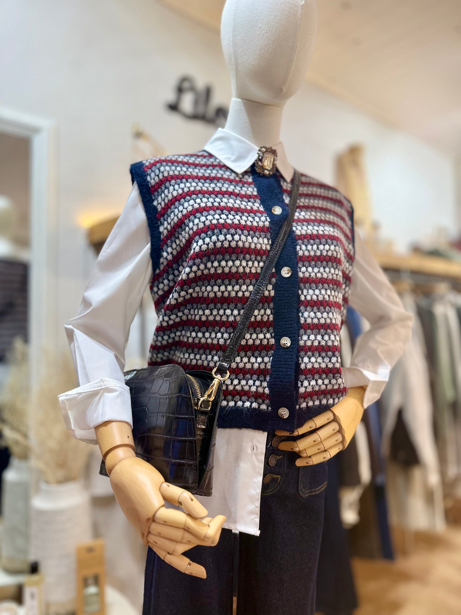 Un joli gilet sans manches esprit “tricot rétro chic”, parfait pour apporter du style à une tenue toute simple.