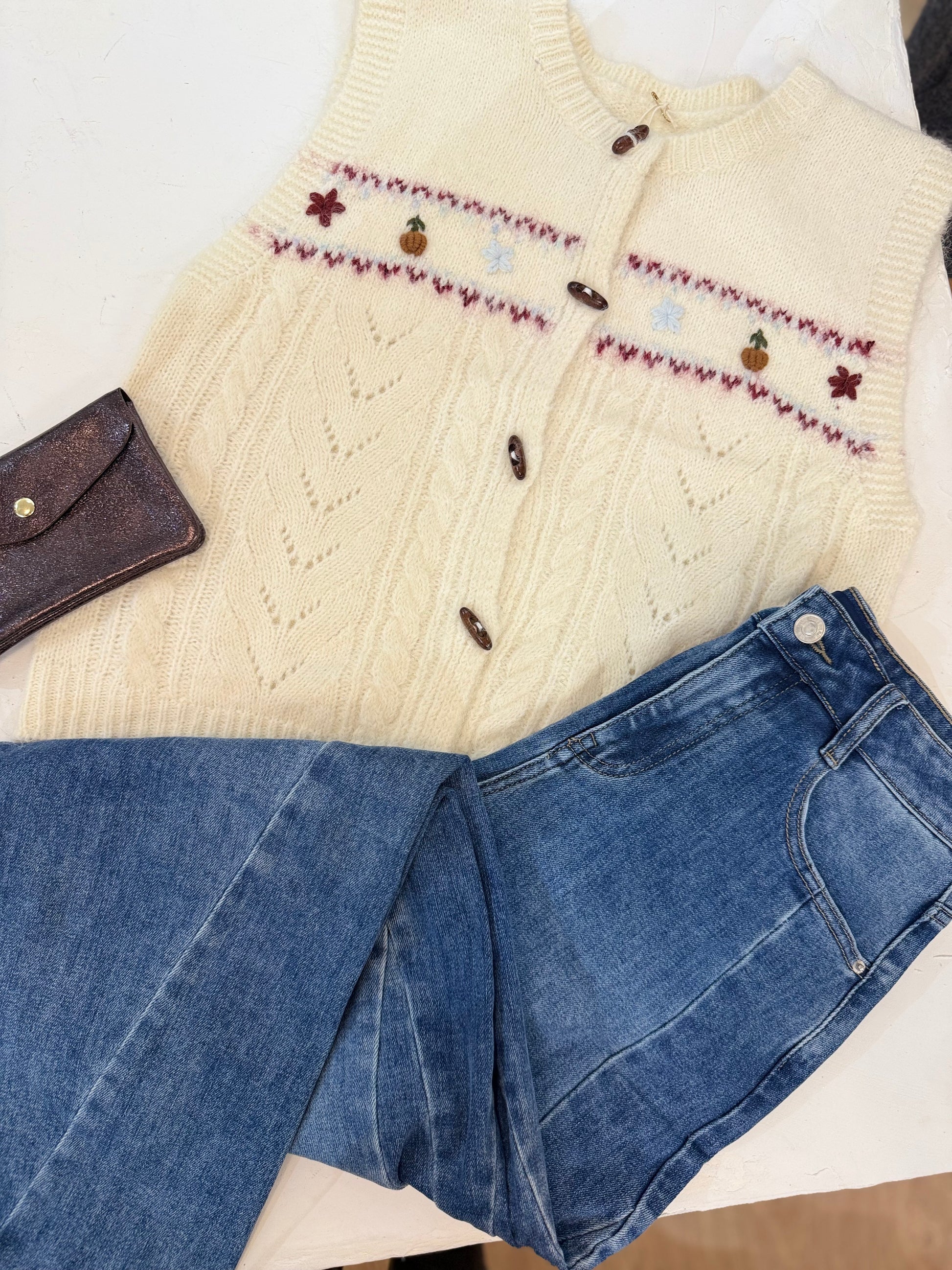 Craquez pour ce gilet sans manches au charme délicatement bohème. Confectionné dans une maille douce et chaleureuse, il se distingue par ses jolis motifs brodés et ses boutons effet bois, qui lui donnent un style authentique et raffiné.