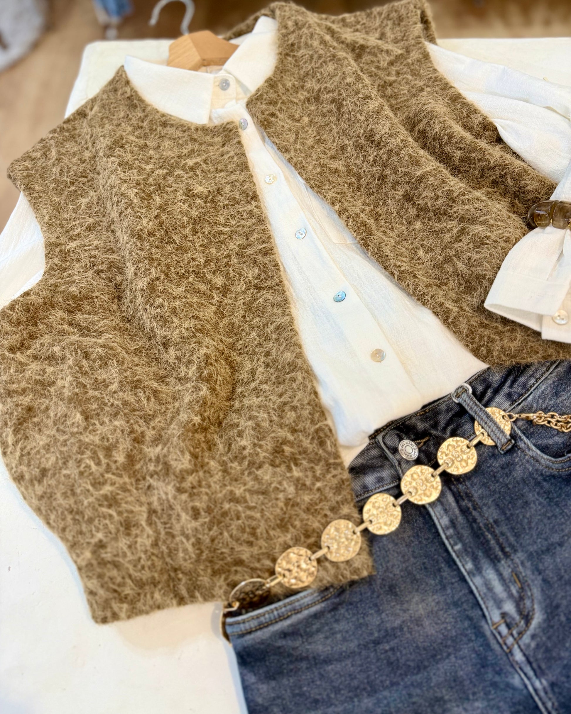 Cette veste sans manches se porte aussi bien sur une chemise, un pull fin ou un sous-pull pour un style cosy et moderne.