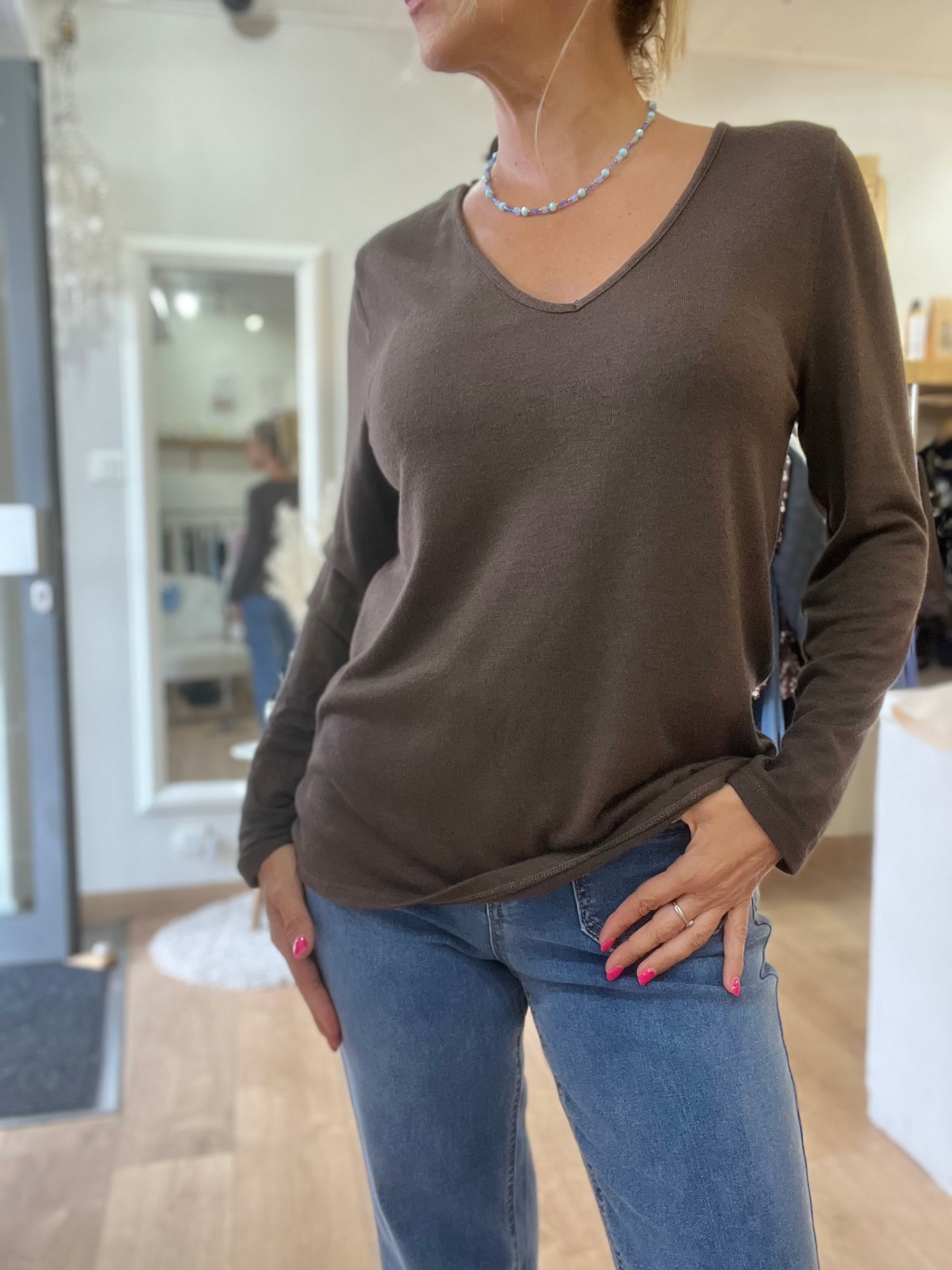 Ce pull à col V met en valeur le décolleté tout en restant élégant. Ses manches longues légèrement retroussables apportent une touche décontractée. Sa maille fine et douce en fait un indispensable pour la mi-saison comme sous un manteau en hiver.