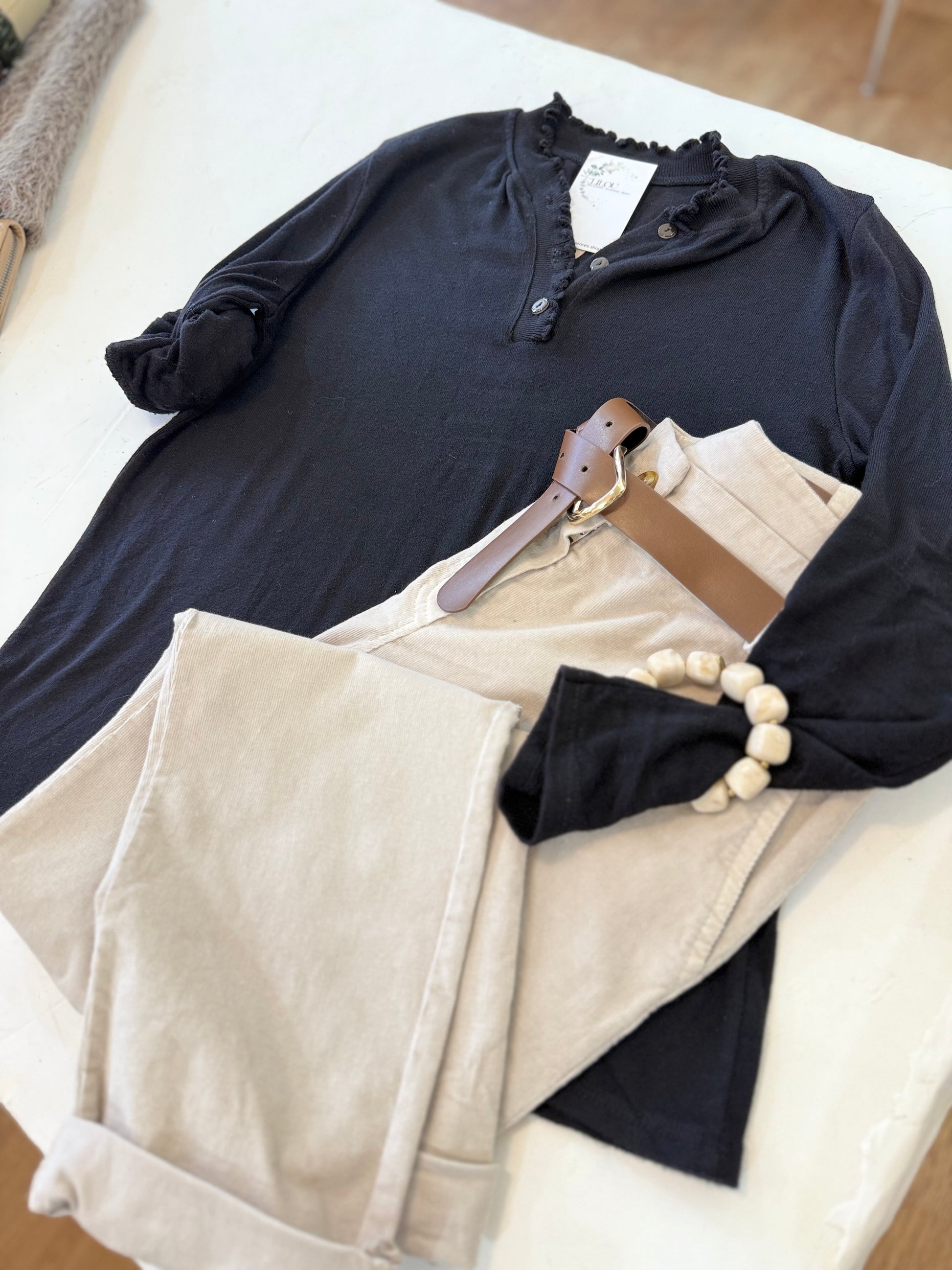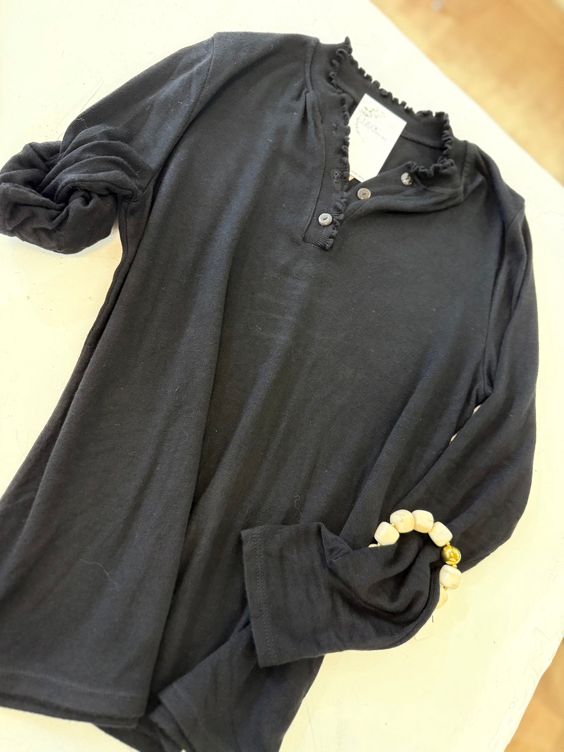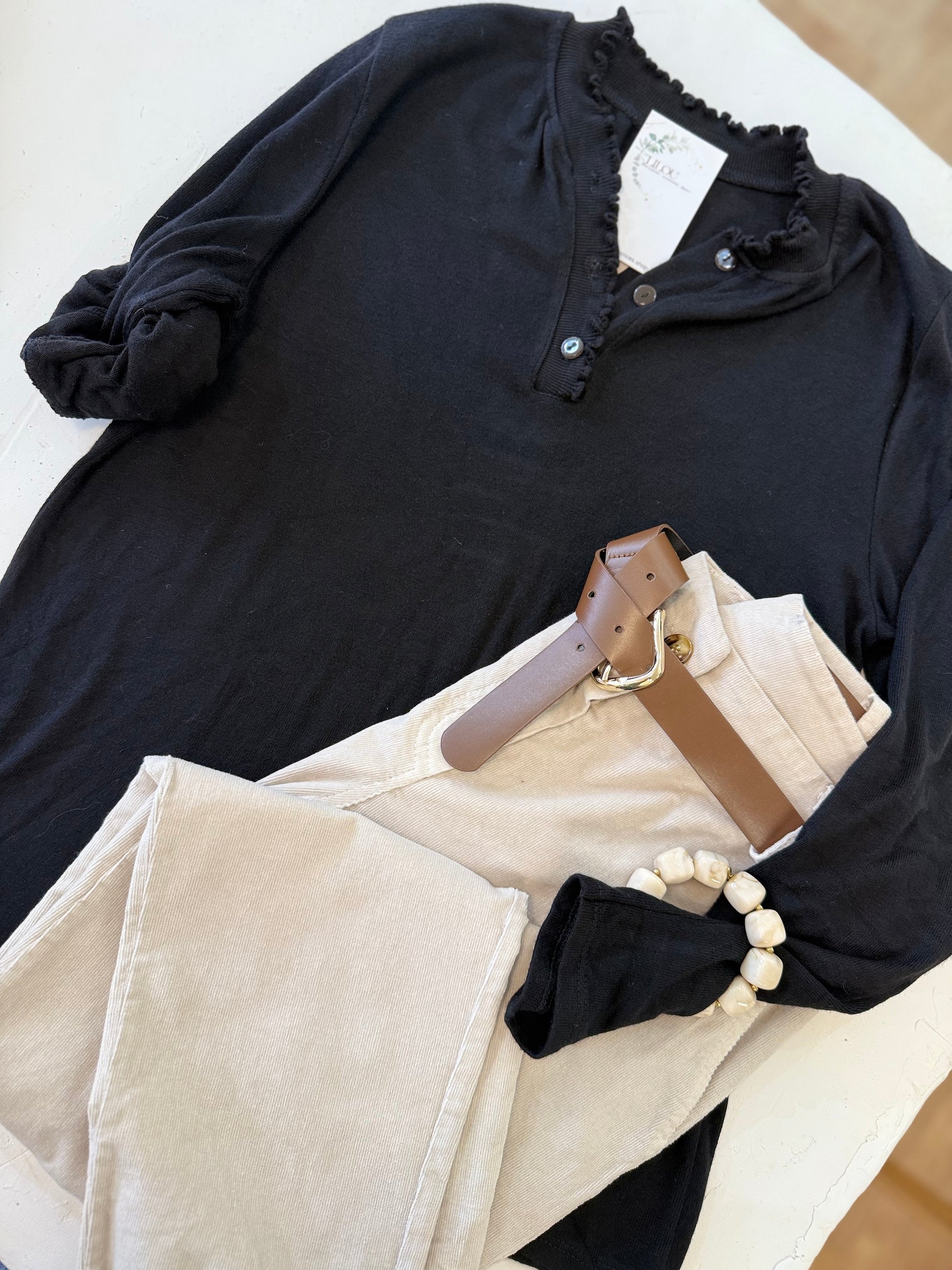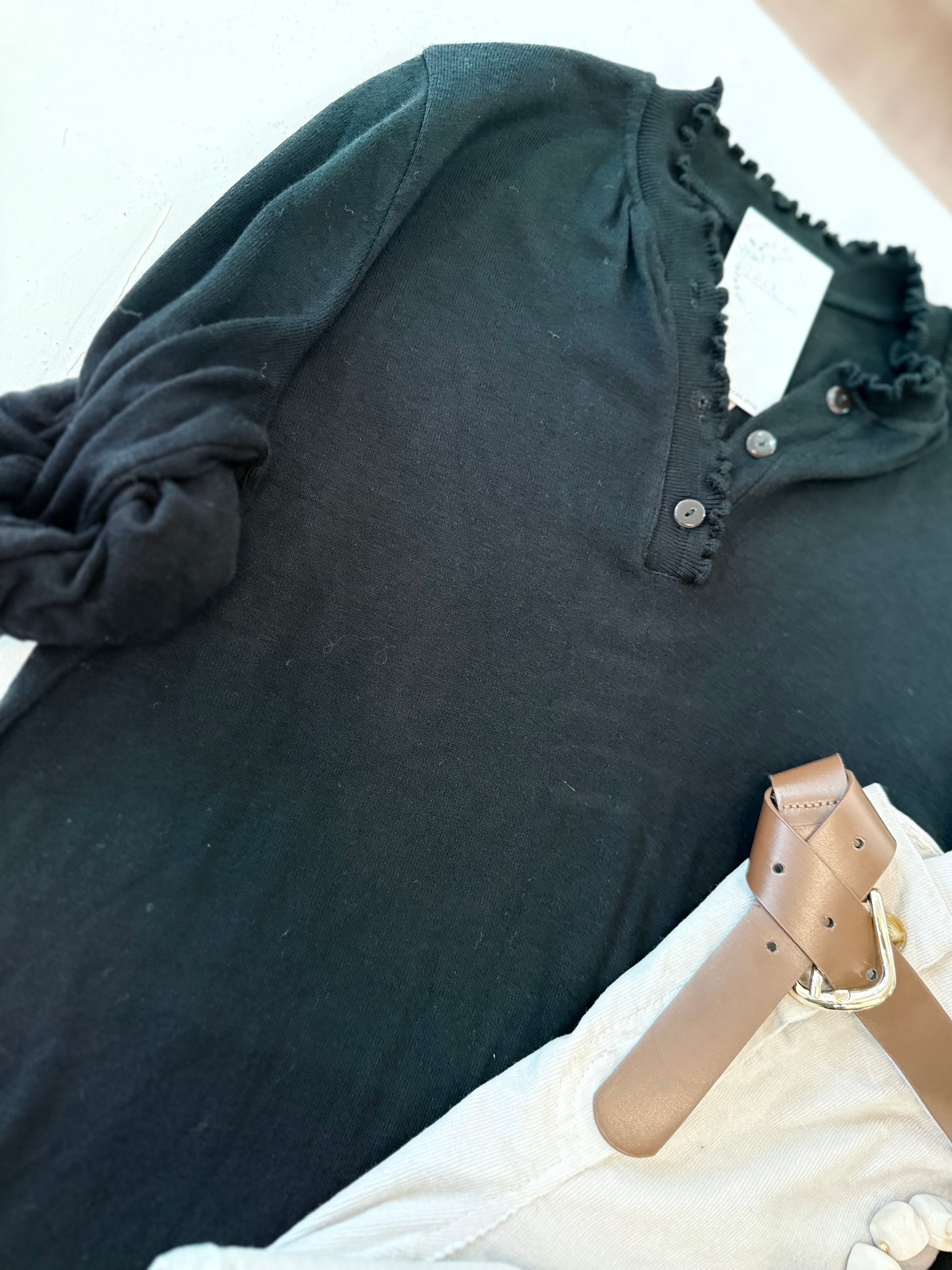 On adore son col légèrement volanté et sa patte de boutonnage qui apporte une touche délicate et raffinée.