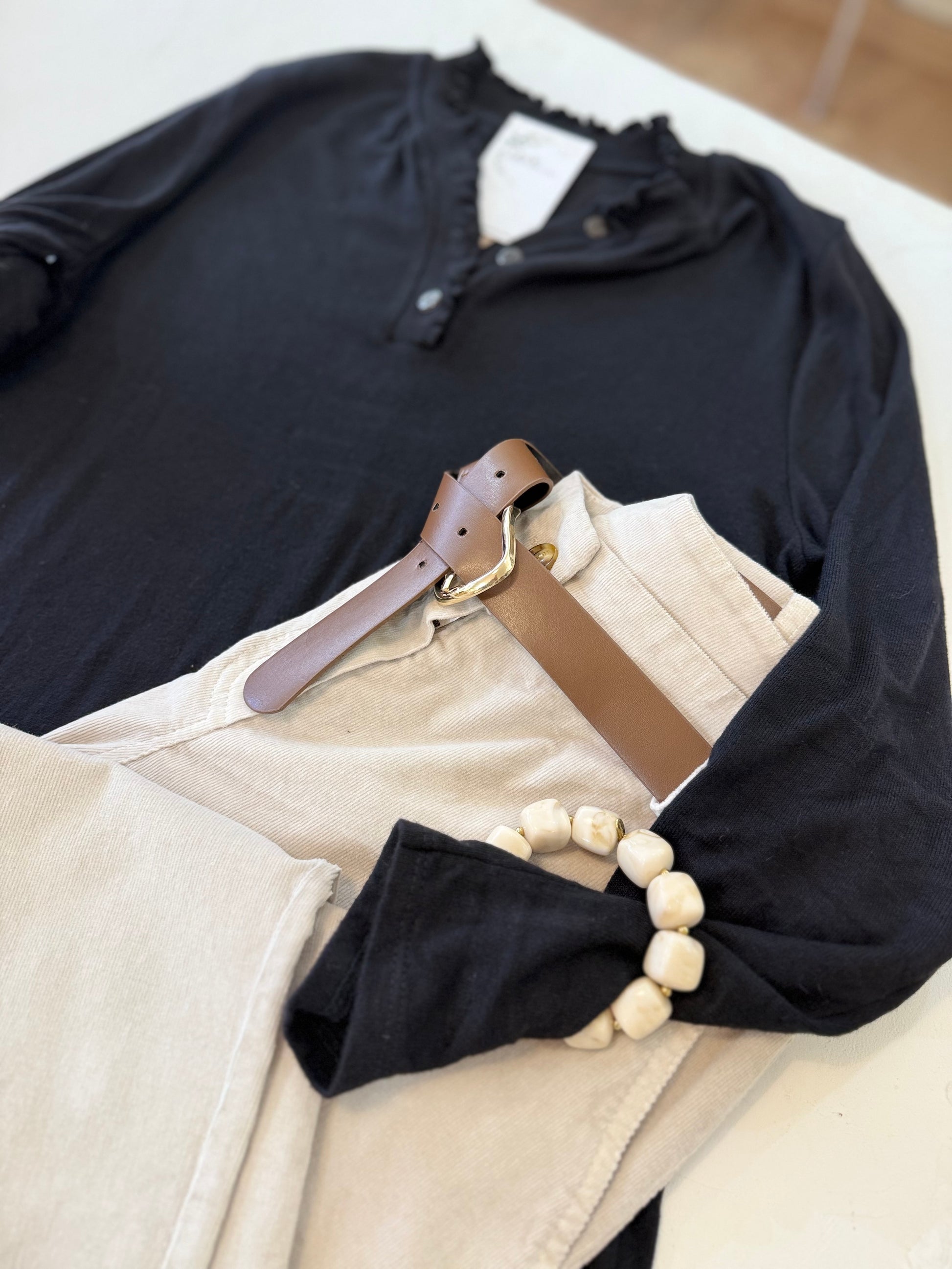 Associe-le à un jean taille haute et une ceinture dorée pour un look casual chic.