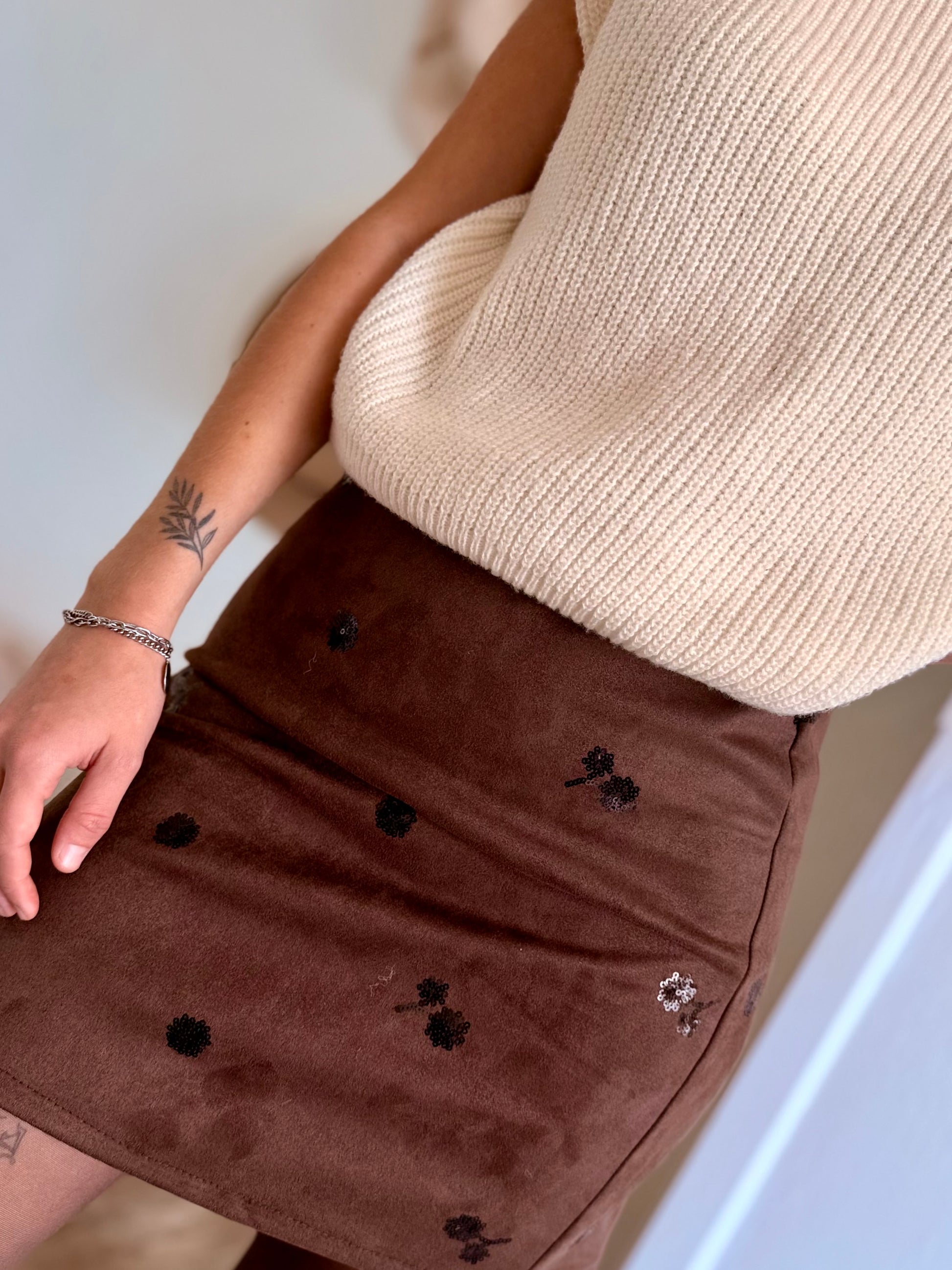 Sa matière douce effet suédine et ses délicates broderies de sequins ton sur ton apportent une touche raffinée à ton look, tout en restant confortable et moderne.