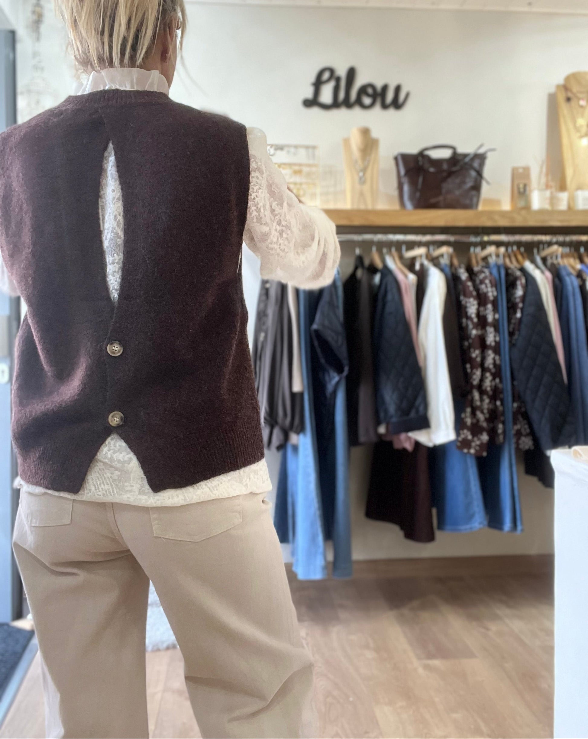 ✨ Original et raffiné, le pull « Maëlys » joue sur l’effet superposition avec style. Composé d’un pull sans manches coloris chocolat et d’un top manches longues en dentelle écrue, il apporte élégance et confort en un seul vêtement.
