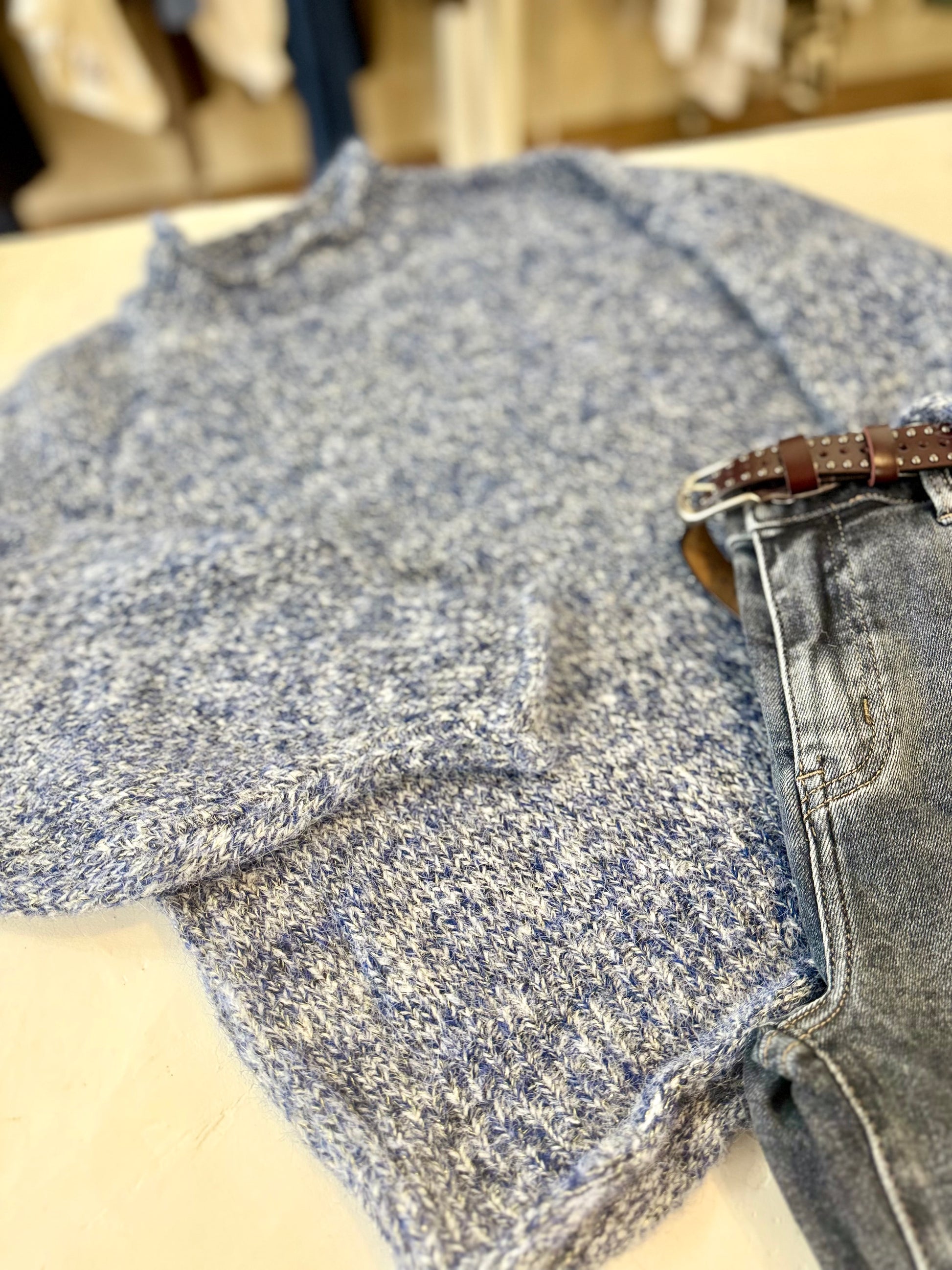 Sa maille bleu chiné donne du caractère à la tenue tout en restant douce et facile à porter.