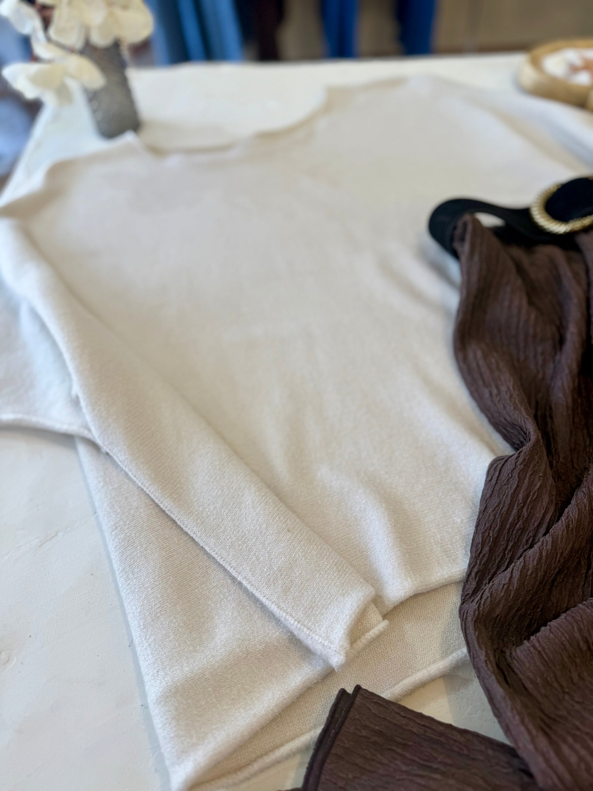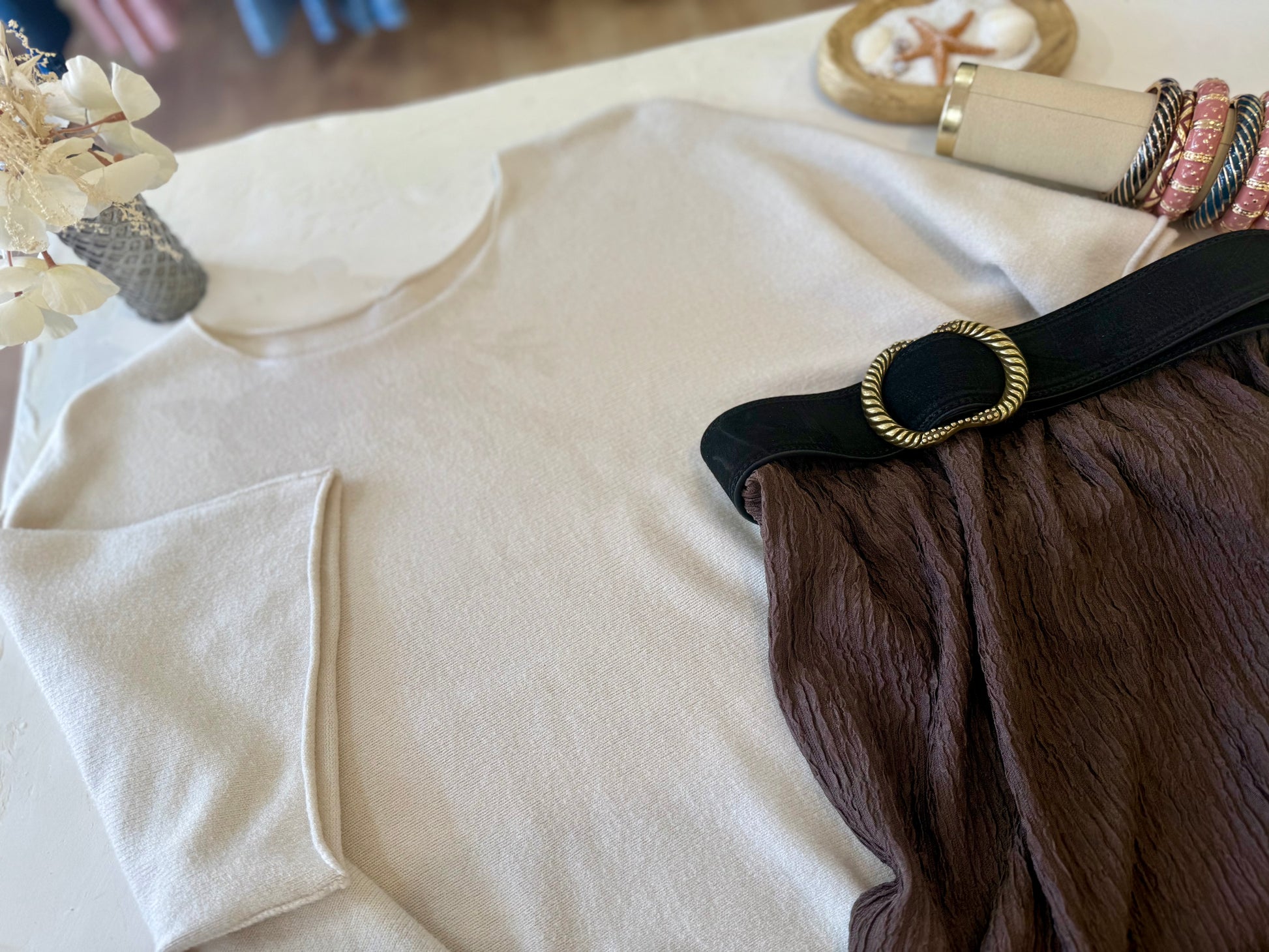 Avec sa coupe loose ultra-confortable et sa maille toute douce, il s’adapte à toutes les morphologies du 36 au 50 environ . Fabriqué en Italie, il allie simplicité et élégance : porté avec une blouse ou chemise pour un look chic, ou seul pour une allure décontractée.