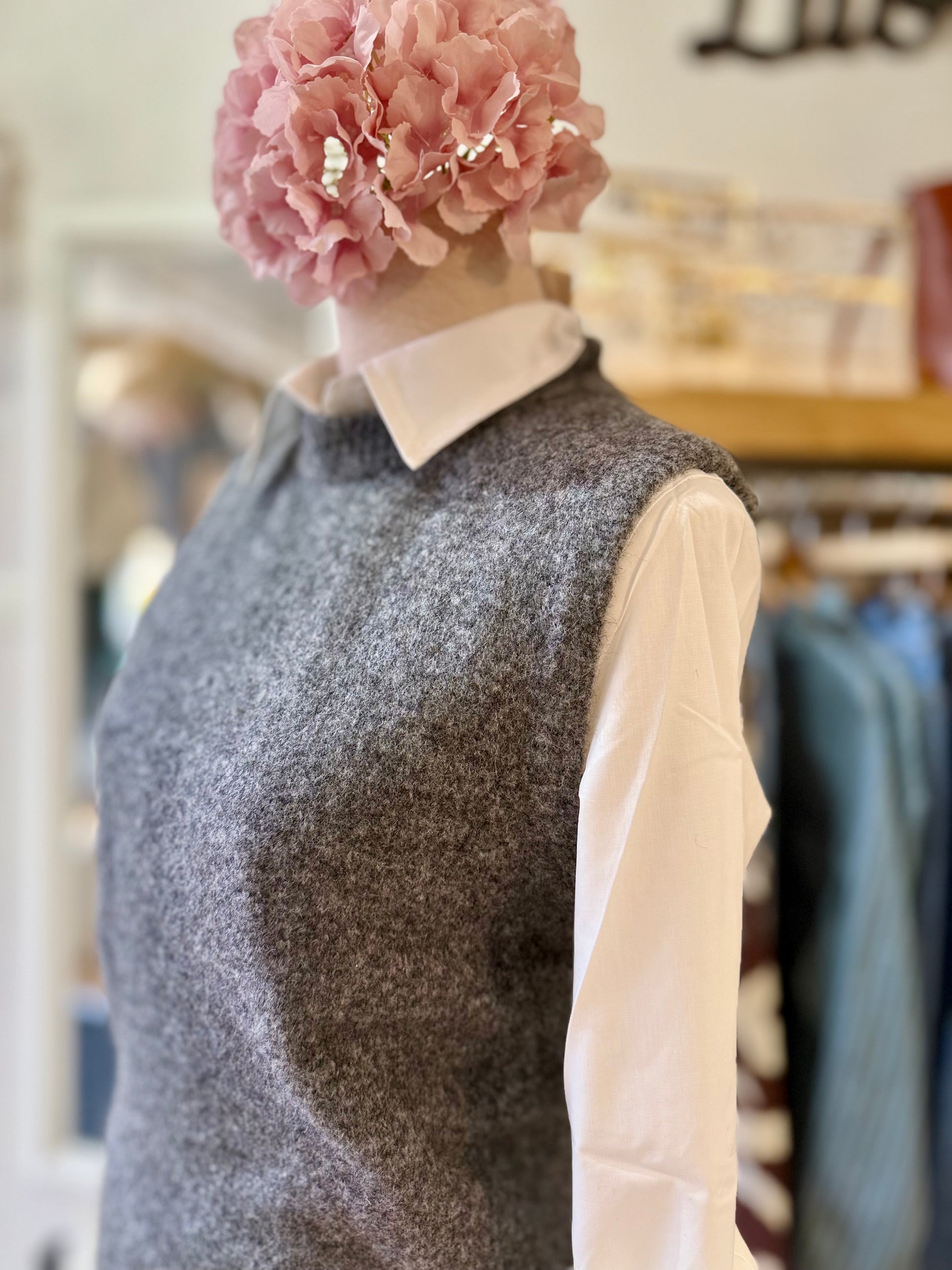 Sa teinte gris foncé intemporelle en fait une pièce versatile, à porter seule ou superposée avec une chemise, un col roulé ou un tee-shirt.