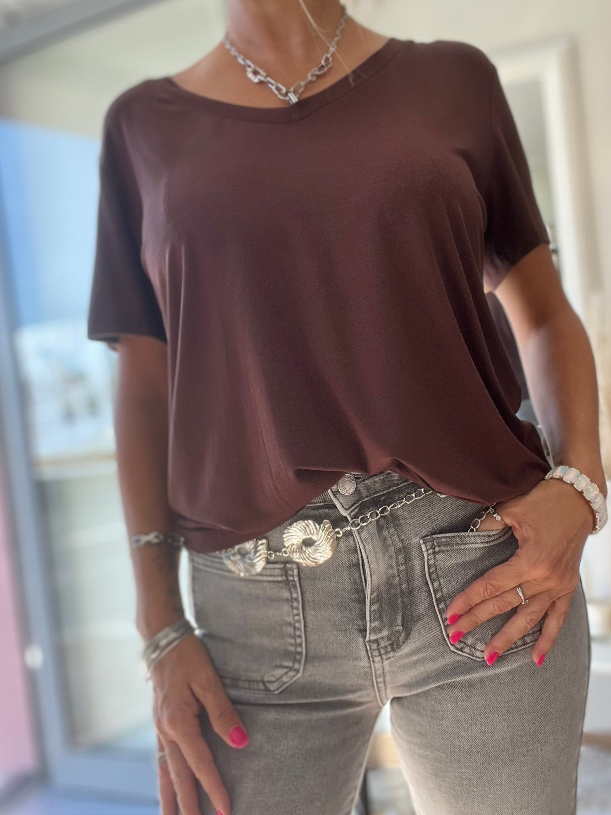 ✨ Le T-shirt « Douceur » est le basique indispensable à avoir dans sa garde-robe. Avec sa coupe féminine et son col V, il se porte aussi bien seul que sous une veste ou un gilet.