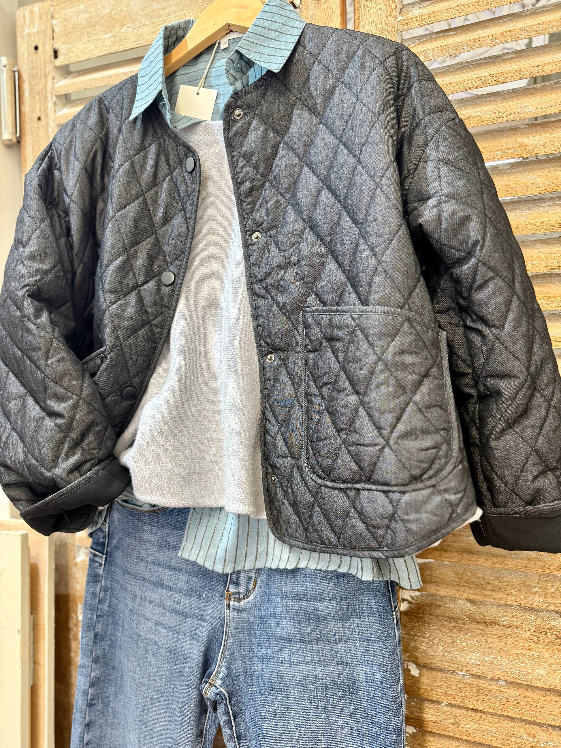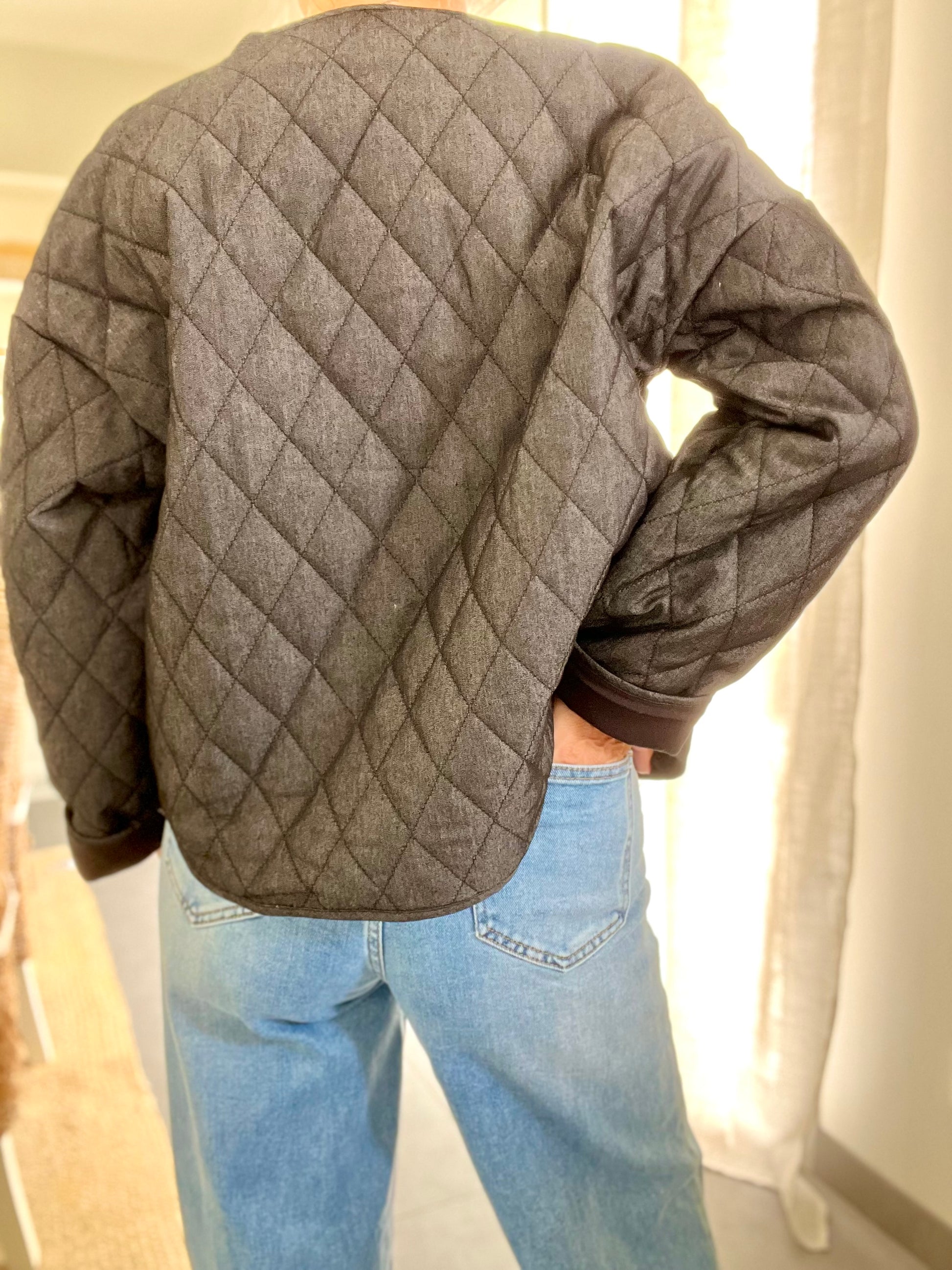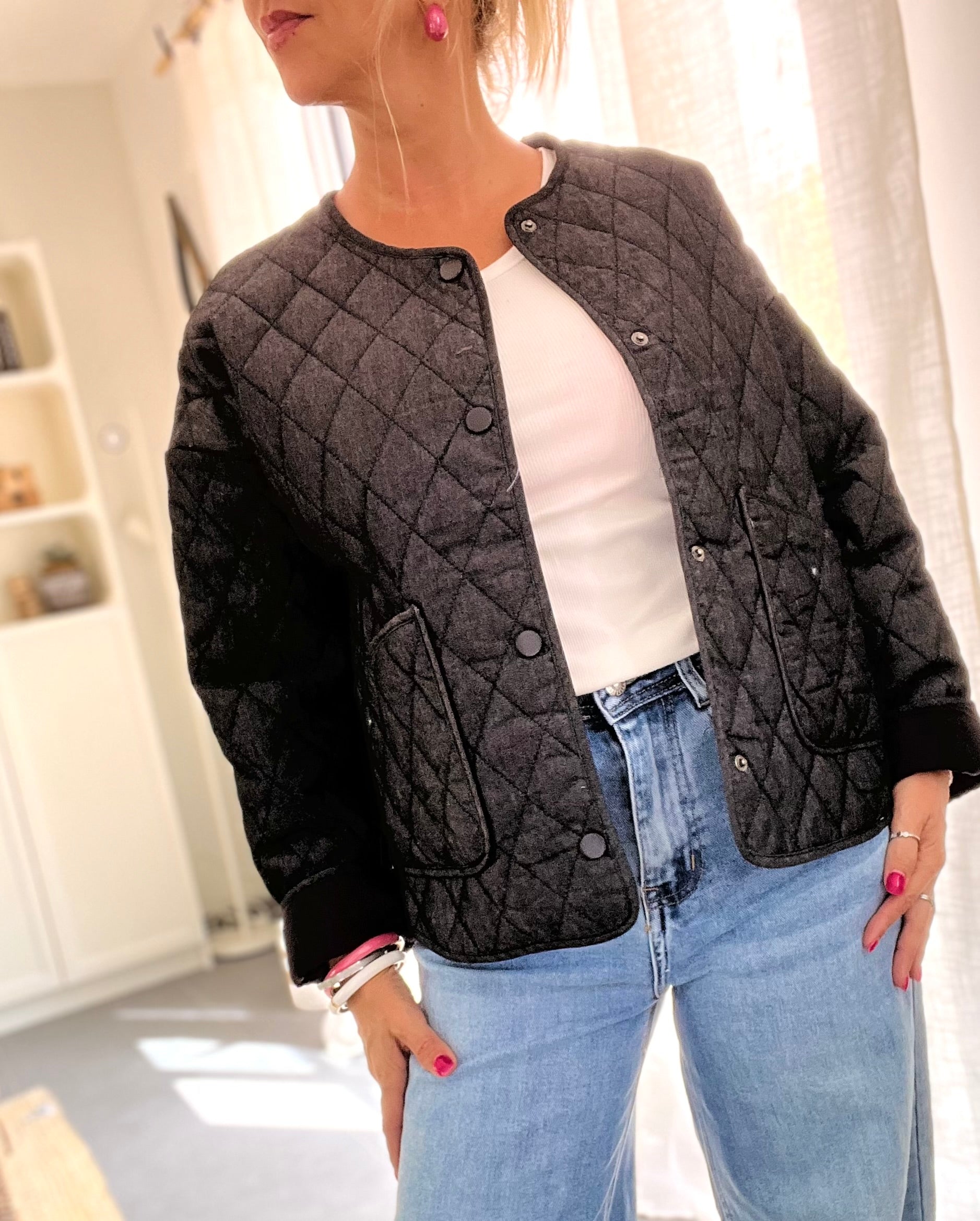 ✨ La veste matelassée « Nova » est la pièce tendance et pratique de la saison. Avec son coloris noir aux reflets bleutés et son motif losange, elle combine style et confort au quotidien.