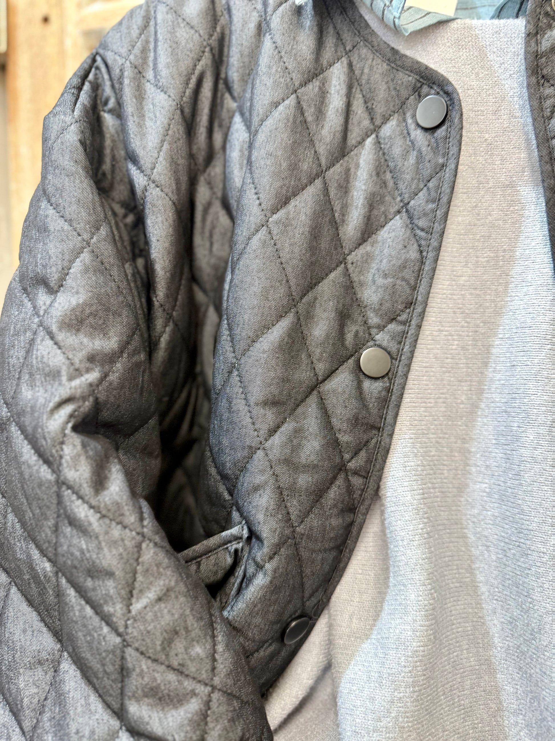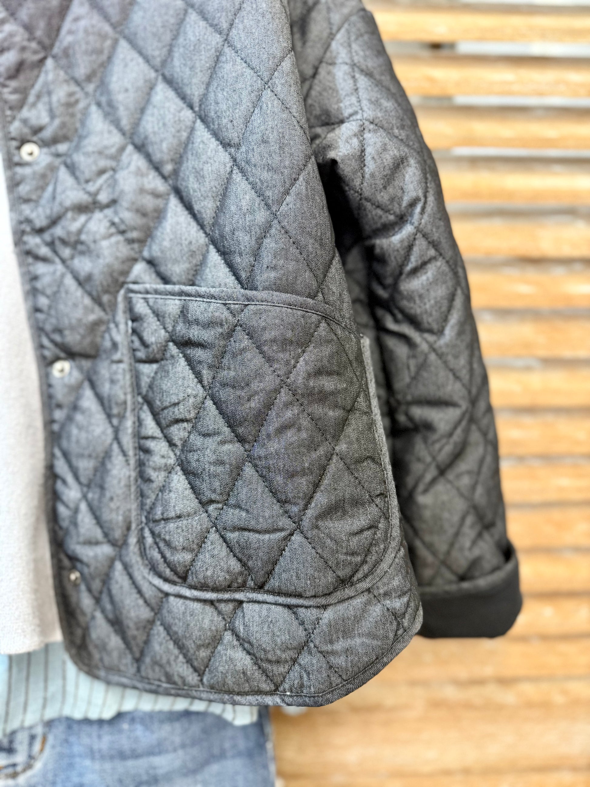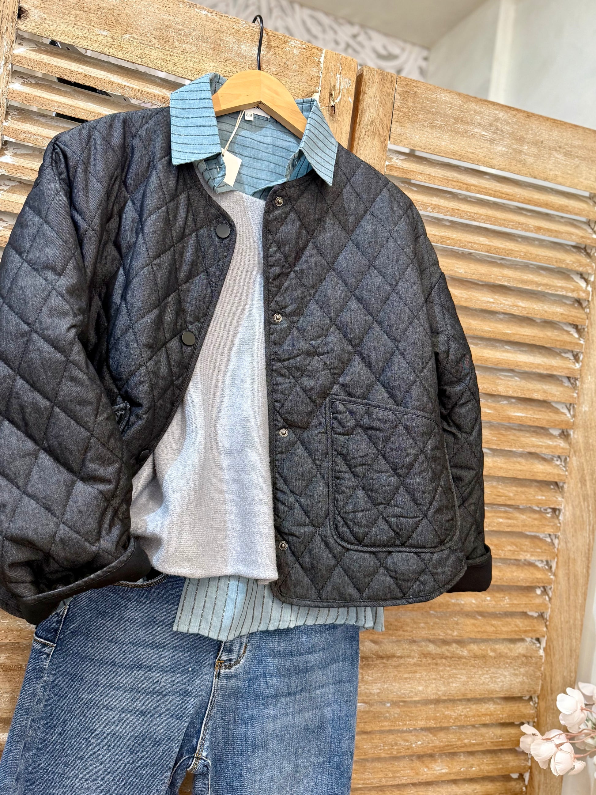 ✨ La veste matelassée « Nova » est la pièce tendance et pratique de la saison. Avec son coloris noir aux reflets bleutés et son motif losange, elle combine style et confort au quotidien.